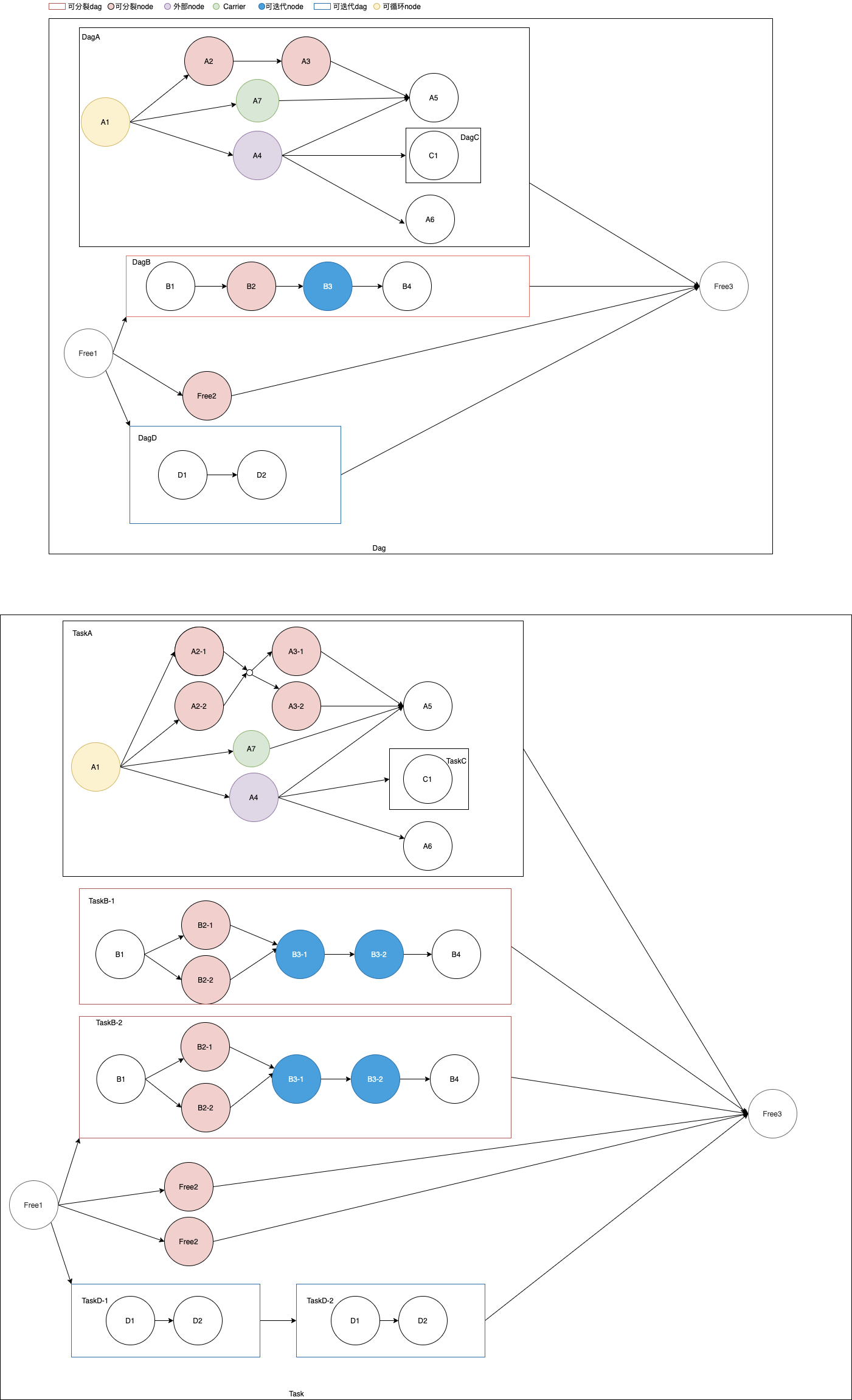 - 可分裂Node: 执行时,分裂出多个Step并行处理,达到map的效果。如A2, A3, B2, Free2